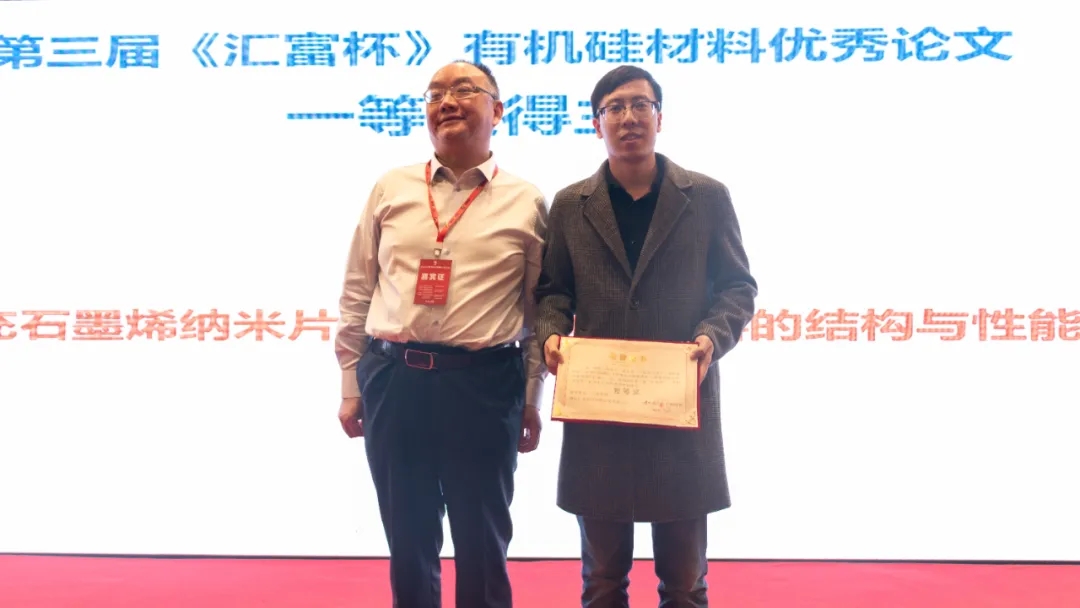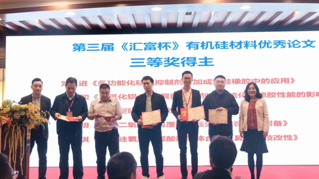 有機硅材料編輯部主任張愛霞女士,湖北匯富納米材料股份有限公司銷售總監胡利建先生為三等獎得主頒獎。
