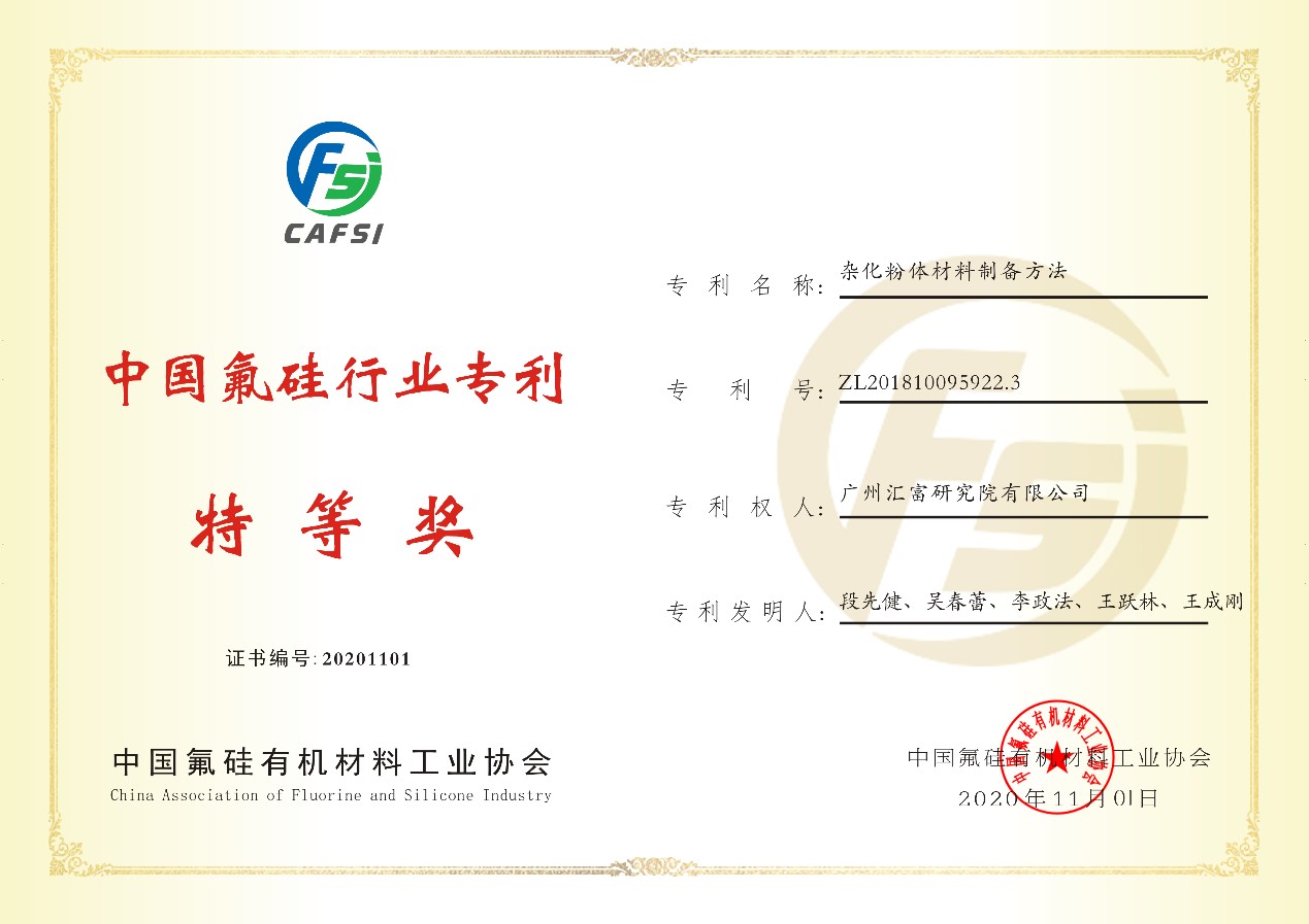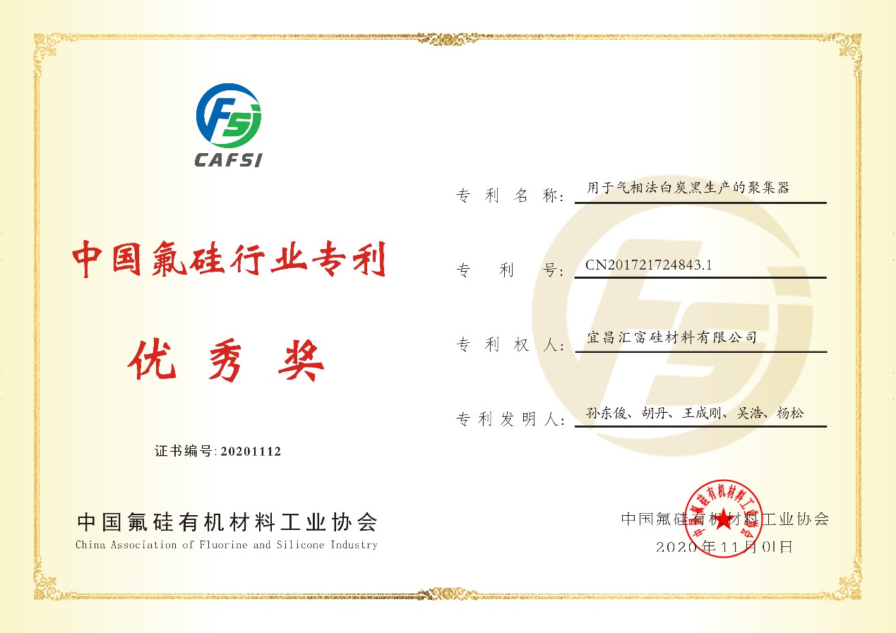 會議期間頒發了2020年中國氟硅行業專利獎,湖北匯富納米材料股份有限公司(原名宜昌匯富硅材料有限公司)及其全資子公司廣州匯富研究院有限公司參評兩項專利獲獎。其中《雜化粉體材料制備方法》榮獲特等獎,《用于氣相法白炭黑生產的聚集器》榮獲優秀獎。
